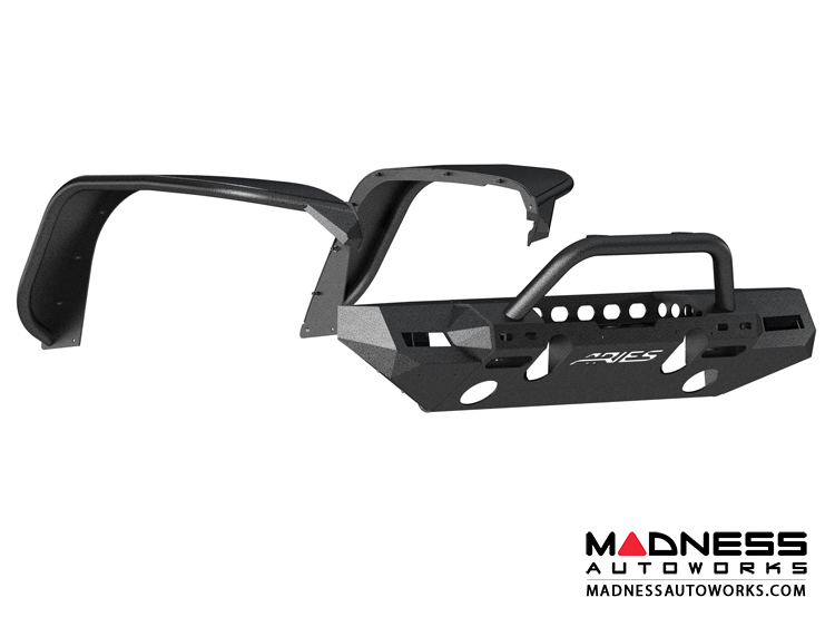 This particular bumper and fender flare kit includes the bumper center section, corner end caps, round center brush guard and front fender flares. The bumper corners feature unique cutouts to integrate the Jeep JL fender flare turn signals when installing the ARIES fender flares. The Jeep fender flares feature a flat profile that is specifically designed to show off larger, offroad tires. They are constructed from lightweight, rust-free aluminum and feature a unique textured black powder coat finish to maximize corrosion resistance and help hide minor scratches and grime.