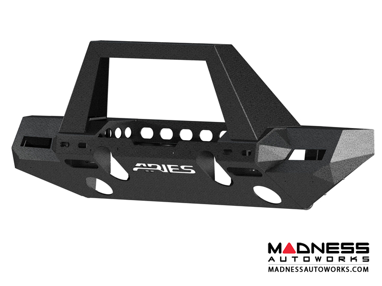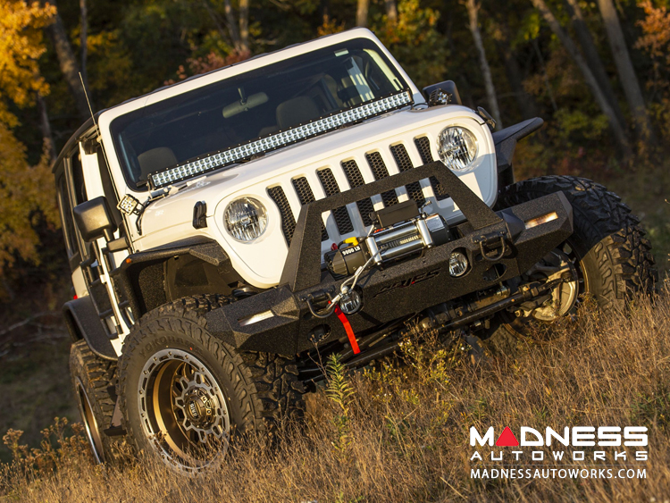 This particular bumper includes the center section, corner end caps and angular center brush guard. The corners feature unique cutouts to integrate the Jeep JL fender flare turn signals when installing aftermarket fender flares. This bumper also features a standard winch housing and provides mounting points for additional LED lights, D-rings and tow hooks. It is constructed from high-strength carbon steel and has a unique, textured black powder coat finish for maximum rust resistance. It is also available in powder-coated aluminum.