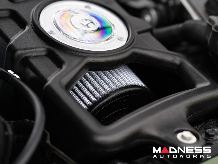 This Momentum GT intake system was designed around the largest filter possible to allow maximum performance and filtration. This filter has a massive 5" round flange and is 8" tall with an inverted top and features our non-oiled Pro DRY S media. The Pro DRY S performance air filter features 3-layers of progressively finer porosity synthetic media that does not require oil providing maximum convenience. The unique air filter to housing interface (patent pending) allows for maximum filter size which increases the available air volume while simplifying the installation process