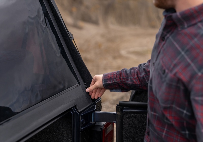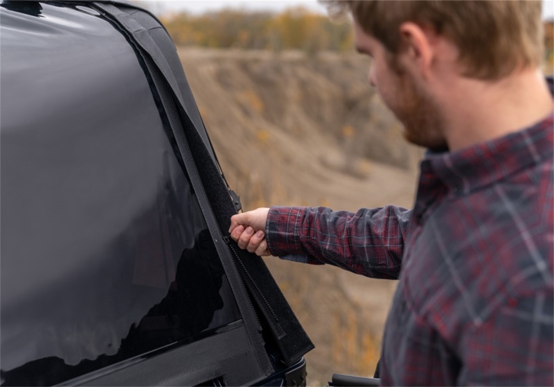 This Rampage Frameless Trail Top is made from OEM-spec waterproof Black Diamond vinyl and is built as a dual top system for year-round use. The design accepts larger side windows for improved visibility and uses heavy-duty molded-tooth zippers for reliable removal and reinstallation. Windows store in an on-board ceiling panel to protect them from scratches and punctures when not in use. The fastback profile reduces wind turbulence compared with bow-style tops and contributes to a quieter ride. Note: windshield channel, tailgate bar, tub rail kit and windshield upright inserts are required for attachment and are available separately. Door surrounds and door skins are included for half-door applications.