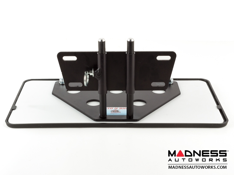 The STO N SHO is a two piece detachable front license plate mounting system consisting of a front license plate holder and a base mounting plate that allows for the easy removal of the front license plate when desired and the quick replacement of the front license plate when needed. When the front license plate holder is removed the remaining base plate is virtually undetectable. The STO N SHO allows you to comply with state law while maintaining the beauty of your Jeep Renegade.