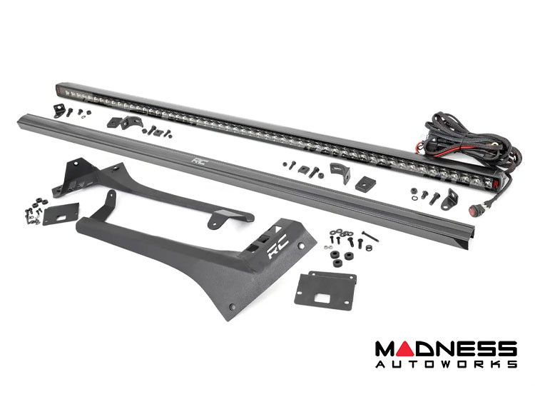COMMAND THE DARK with Rough Country’s 50-inch LED Upper Windshield Light Bar Kit for your Jeep Gladiator JT. This easy-to-install kit is the ultimate lighting upgrade, combining style and functionality to elevate your off-roading experience. Designed for forward-facing visibility, this mount securely holds a 50-inch LED light bar between the top of your Gladiator's windshield and roof, giving your vehicle an aggressive and commanding look while spanning the entire width of your roof.
