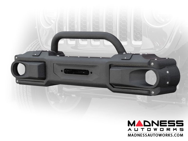 This front bumper was designed specifically for the Jeep JL and Gladiator. This is DV8’s most modular bumper and comes with the full-length wings and a stubby center section. It can also accommodate a 12,000 lbs winch and comes with a winch delete plate. Even the bull bar is modular, and to top it all off it accommodates fog lights.