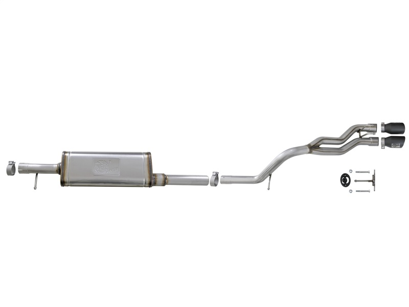 This exhaust system is complete with meticulously designed 4-1/2" black tips that prominently feature the aFe power plates. Constructed out of stainless steel, these tips are not only about aesthetics but also stand the test of time. Every component, from the 22" free-flowing muffler to the OE-style bayonet hangers, band clamps, and provided hardware, has been thoughtfully designed for a seamless, hassle-free installation process.