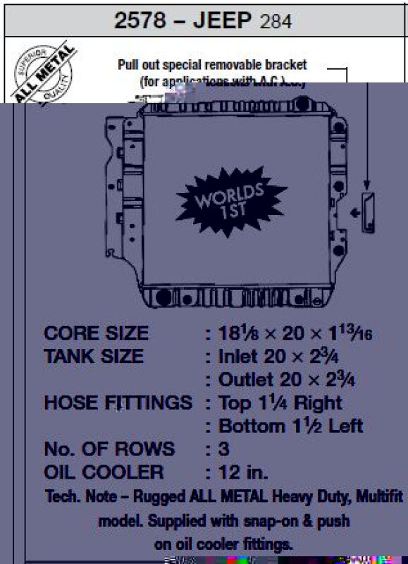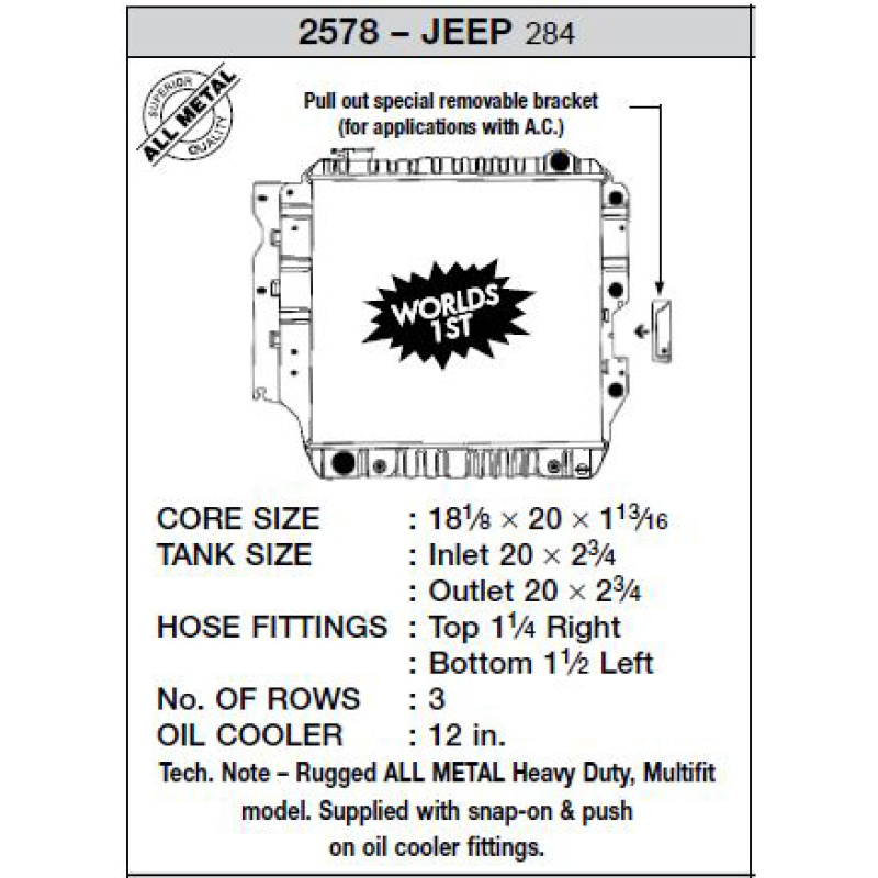 World exclusive multi-fit model, only from CSF - fits all automatic and manual Wrangler YJ and TJ models. CSF's #1 selling copper/brass Jeep model with over 20,000 sold - a cult favorite among Jeep enthusiasts who wish to keep their original style copper/brass radiator, but desire higher performance and more durability. CSF has over 5 decades of experience manufacturing radiators. So when it comes to keeping your engine cool and your Wrangler running at its finest, a CSF Heavy-Duty Radiator is the obvious choice. CSF has spent years refining and improving their radiator designs. The original style copper/brass construction features ribbed brass end tanks for additional strength and reinforced side end plates and integrated metal core straps to withstand heavy vibration and chassis flex while off-roading. The 3-Row 46mm Heavy-Duty and High-Performance Copper Core offers the best cooling available in a design that is a true "drop-in" fit with no modifications necessary for installation. Whether you are off-roading, towing, or just casually driving your Wrangler, trust the cooling experts at CSF for the best performing, high-quality, and reliable radiators.. The CSF #2578 Cooling product is designed to be a "Drop-In Fit" application. The product will install in the OEM Location with no modifications necessary unless otherwise noted or instructions are included in the product package. Please see the manufacturer repair manual for standard installation instructions. If you do not feel confident installing this product CSF recommends taking it to a qualified installation facility.. CSF manufactures the most advanced and efficient radiator in the industry for your Wrangler. CSF uses innovative tube and fin technologies with industry-leading testing methods to maximize airflow and heat dissipation.. OEM specified "Single Piece - Deep Drawn" Brass Tanks with Ribs for added Strength & Durability. Built for OEM Cooling - High Performance Transmission Cooler with special Built-in Turbulators. No risk for coolant contamination and damage to sensitive seals, water pump & thermostat. Fins (Heart of Radiator) - High Performance "Multi-Louvered Design" - OEM Spec. Tubes - Special coated OEM specified "Double Lock Seam Joints" for Long Life. All components are installed, torqued & tested on Radiator during assembly. 100% leak tested before leaving factory at 150% of operating pressure. Reinforced Inlet & Outlet Connections with "Thru Pipe Design". Industry Best Packaging - "10 Foot Drop Test" Standard. Side Channels - Coated Steel for Strength & Durability. CSF 87-02 Jeep Wrangler 2.5L OEM Plastic Radiator. 87-04 Jeep Wrangler (3 ROW Copper Core) Radiator. CSF 2578 - 87-04 Jeep Wrangler Radiator. OEM specified Copper-Brass Construction. Easy to recore & repair. CSF Radiator. Drop-in Fit. Radiator