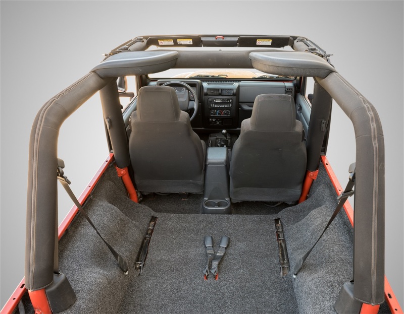 This 100 waterproof, fully custom-molded die cut system is sold as a 3pc front and 4pc rear kit and installs quickly without the need to remove any seat brackets or the center console. Individual pieces can be quickly removed and hosed off after a long day on the trail if desired. The BedRug material dries quickly, resists all harsh chemicals, and will not stain, stink, mold or mildew. The 1/4-inch polypropylene foam kit, with provided heat shields, insulates your interior from road noise and heat.. BedRug Cargo Kit; 4 pc. Rear Kit; Incl. Driver LH Panel; Pass. RH Panel; Tailgate; Cargo Liner; w/o Gussets;. BedRug 03-06 Jeep LJ Unlimited Rear 4pc Cargo Kit (Incl Tailgate & Tub Liner). JEEP BEDRUG 03-06 JEEP LJ UNLTD REAR 4PC CARGO KIT (INC TLGTE/TUB LINER). Ultra Tough Polypropylene Material. JBR 03-06 LJ CARGO. Jeep Kits-BedRug. JEEP BEDRUG