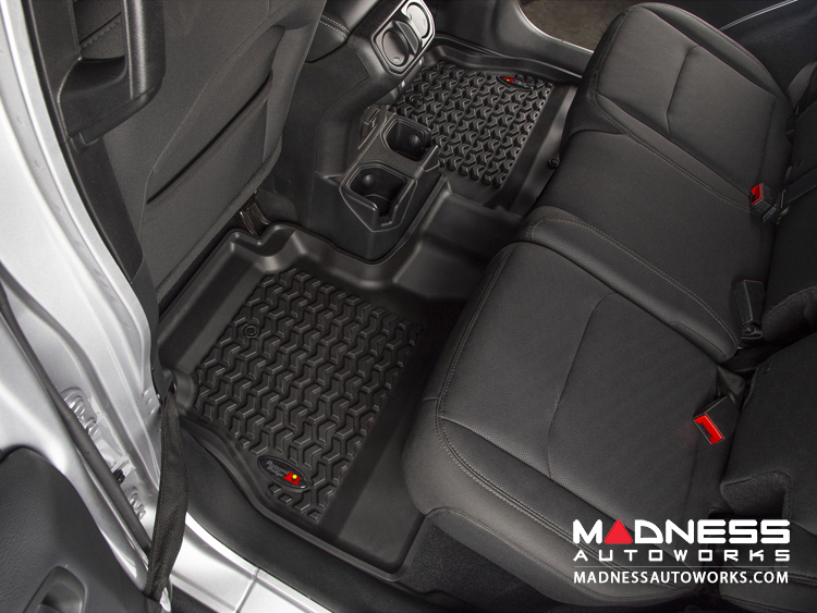Application. The Rugged Ridge All Terrain Rear Floor Liner in Black is exclusively designed to fit all 4-door models of Jeep Wrangler JLs manufactured in 2018.