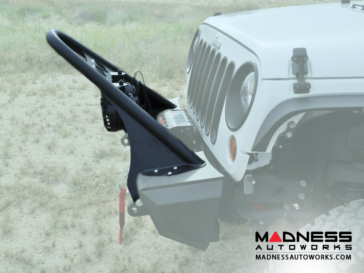 These Jeep JK Stealth Fighter Stingers are designed to improve front end protection, add an aggressive rock crawler look, and all while staying a tight fit to the vehicle. The Stinger bolts into the Stealth Fighter Bumper Center and provides a mount for 2 - 8" Round lights.