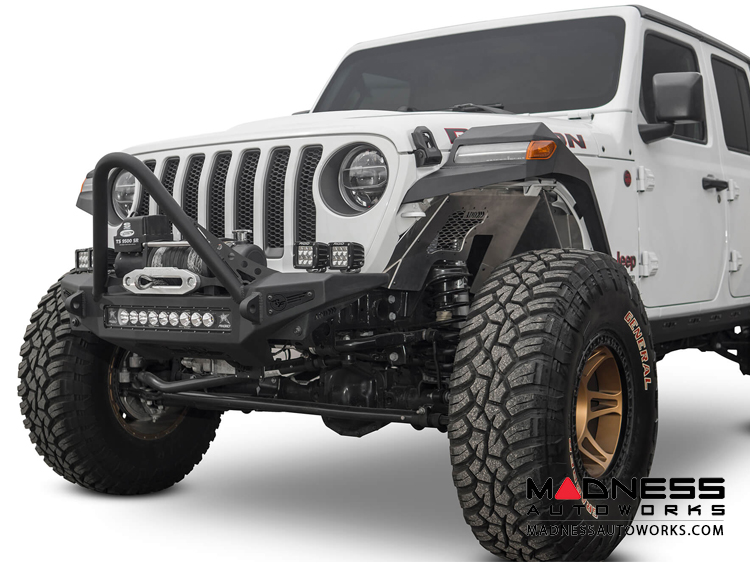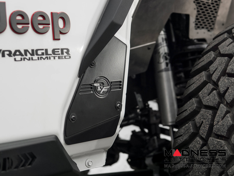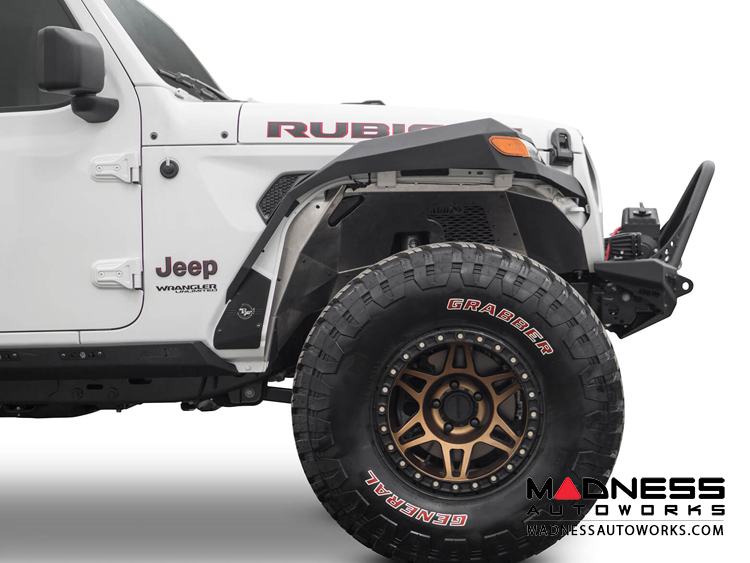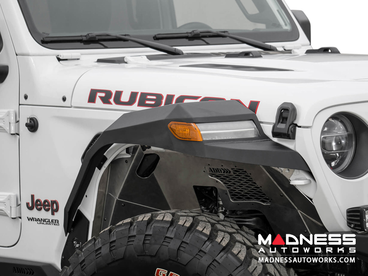 Make your Jeep JL stand out with these new Rock Fighter fenders. The modern plate steel construction provides a unique styling, while retaining OEM amenities. The low-profile design stays tight to the body of the Jeep and allows the use of 37" tires with no lift. Add a 2" lift and gain the ability to run 40" tires. Keep your engine bay protected and complete the look by pairing the Fenders with our Inner Fender Liners.