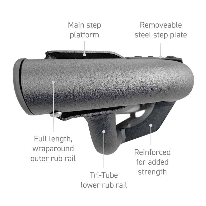 • Removable, paintable steel step plates with Go Rhino's hex pattern