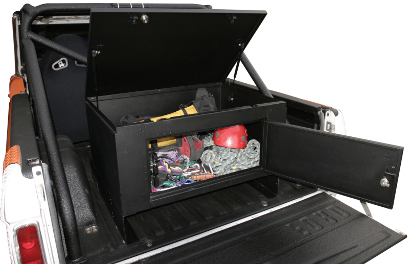 Experience peace of mind with its lockable feature, perfect for safeguarding your tools, camping gear, or any equipment you need securely stowed away. The innovative design includes a large, easily accessible top lid and a separate rear door, each capable of independent operation. This unique hinge mechanism allows the lockbox to maintain a flush mount, ensuring no impact on hinge operation while providing seamless access to your belongings.