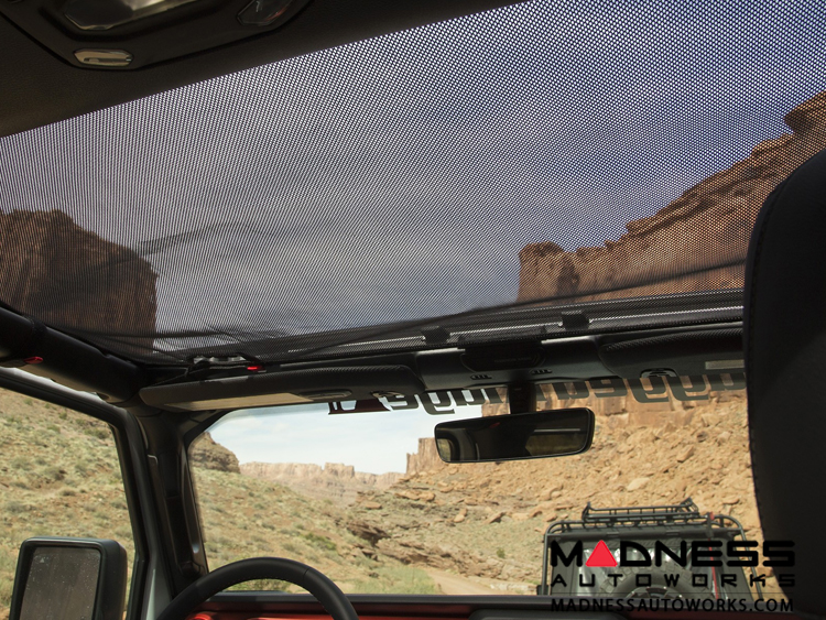 This Eclipse Sunshade gives the open air and top down feeling you want, while providing added protection from harsh sunlight. Featuring reinforced mesh construction with integrated straps, the half sun shade (13579.72) installs between the front portion of the sports bar and windshield to protect front seat passengers while the full-length sun shade (13579.71) is secured between the windshield frame and the rear portion of the sports bar to protect both front and rear passengers simultaneously. By retaining access to the Jeeps top clamps, the Eclipse Sun Shade can stay in place year round- making you fully prepared for that first sunny day. For use with soft top only.