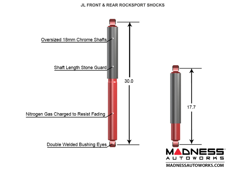 RockSport Long Travel Shocks for the New Jeep JL Wrangler are custom designed. These trail proven Twin Tube Nitrogen Charged RockSport Shocks have proprietary valving tuned specifically to MetalCloak's exacting standards. RockSport Long Travel Shocks have been engineered to work in unison with MetalCloak's True Dual-Rate Coils.