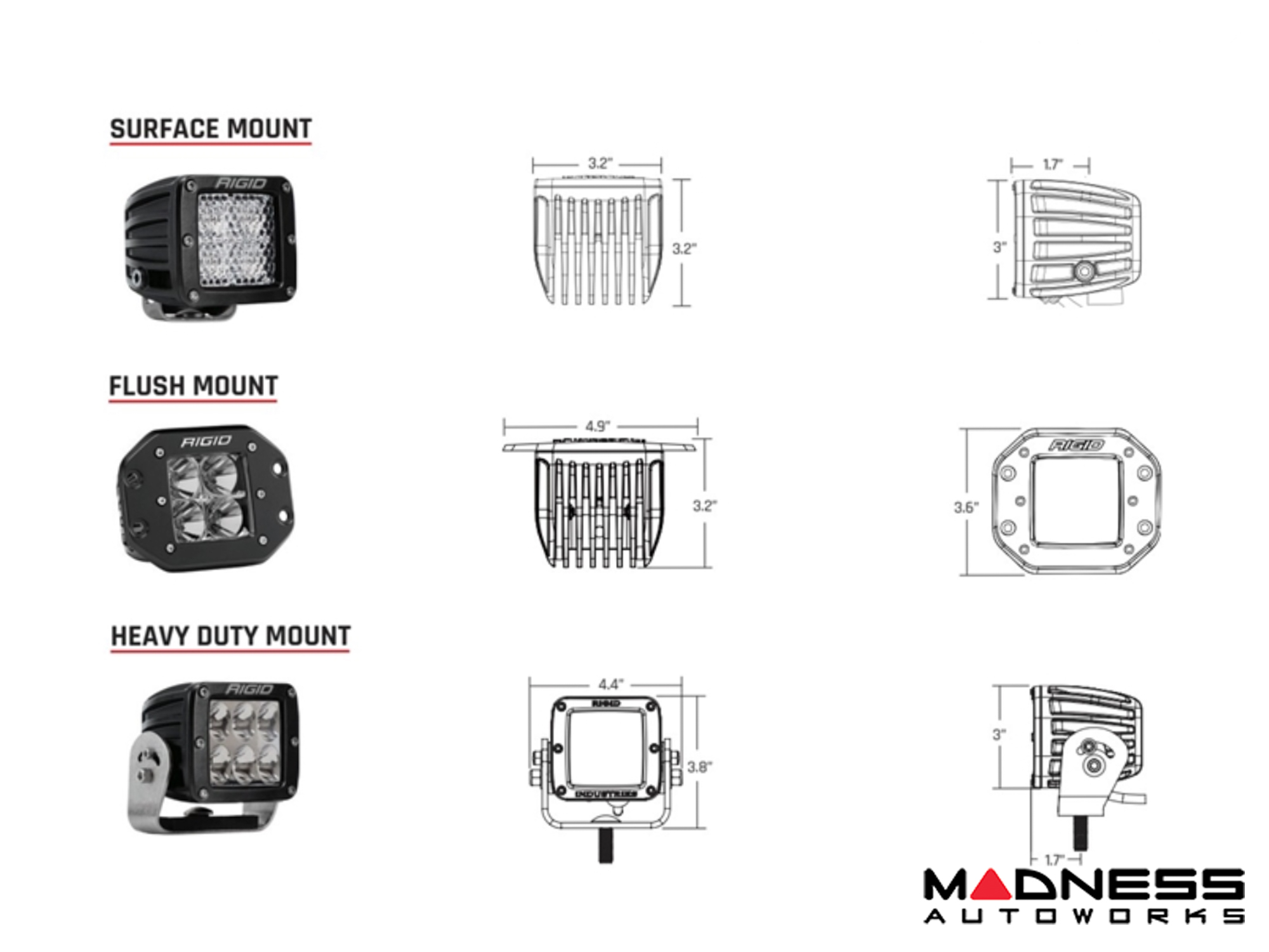 A compact cube similar to RIGID's popular D-Series, the Radiance Pod features independently controlled back-lighting that is available in white, amber, green, red, or blue. The Radiance Pod is built with a rugged aluminum alloy housing to protect the three powerful LEDs inside, while a black exposed printed circuit board is visible through the durable polycarbonate lens for a unique industrial look.
