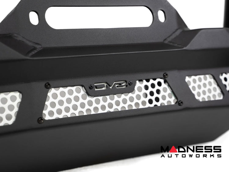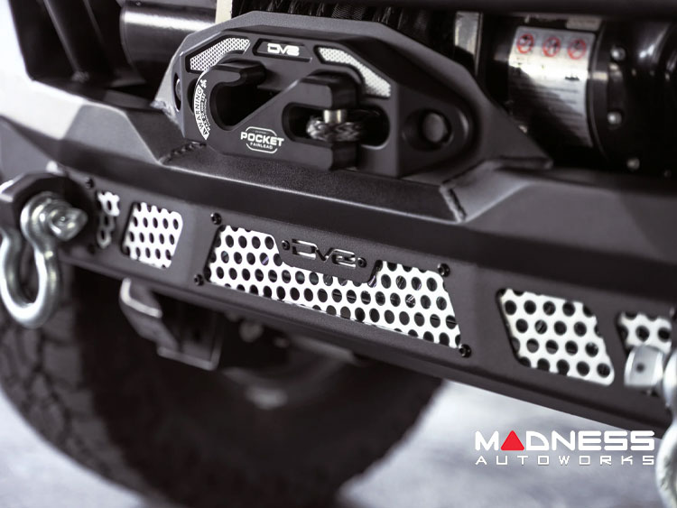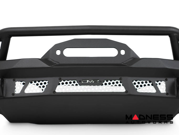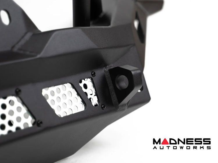 The bumper's appeal goes beyond function, featuring paintable aluminum accent panels that seamlessly merge durability with customization possibilities. Wrapped in a sleek micro-texture black powder coat, this bumper is more than just looks – it's built to withstand the harshest conditions. The fully bolt-on installation ensures a hassle-free upgrade that's ready for action.