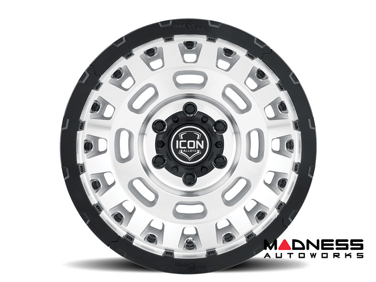 The Custom Wheels - Hammer Pro - Machined Silver - 17 X 8.5 / 5 x 5 / -6mm / 4.5" - Icon is a perfect blend of robustness and refined design. Designed by ICON Alloys, these wheels offer a seamless balance between outstanding off-road performance and stylish urban appeal.