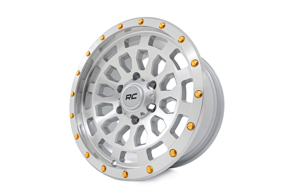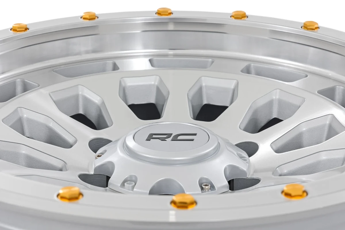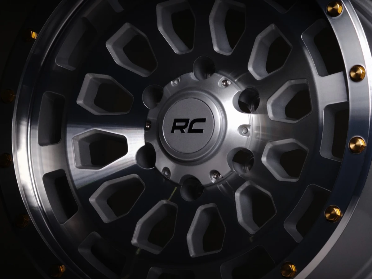 The 87 Series Wheel by Rough Country is crafted for those who crave quality and performance. It features a striking full-machined finish that is accentuated by bold gold accents, making it a standout addition to any vehicle. The simulated beadlock style not only enhances the rugged appearance but also ensures a solid fit, giving your vehicle the robust off-road aesthetic you love. Made from one-piece aluminum, these wheels are lightweight yet incredibly strong, ensuring lasting durability through every journey. Plus, the custom RC center cap, with its bold black RC lettering, adds a clean branded touch that complements the wheel's sophisticated design.