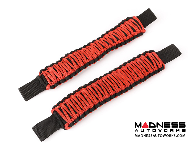 Optimal Grip. Double-wrapped nylon parachute cords give these handles the sturdy structure that provides a stable grip of support for passengers as they take their time safely boarding on and off your Jeep Wrangler. The wide, cushioned design of these handles also provides comfort for passengers. These handles securely attach to the headrest posts of your Jeep Wrangler’s front seats and boldly stand out with a striking black and red color scheme.