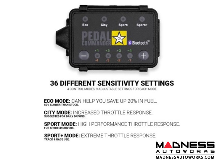 Pedal Commander BT has 4 different control modes: Eco,City, Sport, and Sport+. Each control mode has 8 different sensitivity levels which you can choose. These 36 different parameters, in total, is what makes us different than others. Pedal Commander is programmable according to your desire within your car's specifications.