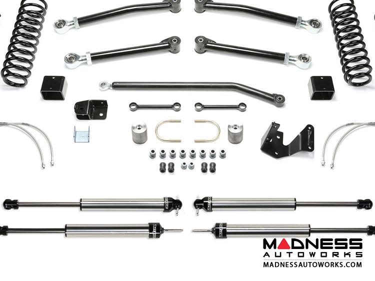 This Short Arm Trail system replaces all four lower link arms because of their vulnerability to obstacles out on the trail. The heavy duty Link Arms maintain factory parallel joint angles in effort to reduce bushing wear. Constructed of .250” thick wall tubing and 5 Ton Joints, this system is guaranteed to hold up to the abuse. The front and rear track bar brackets weld on and re-centers the axles to accommodate for the increased ride height. This system includes Fabtech’s standard coil springs for balanced performance.