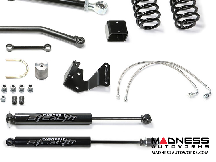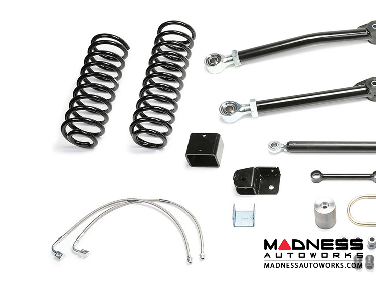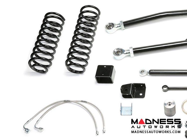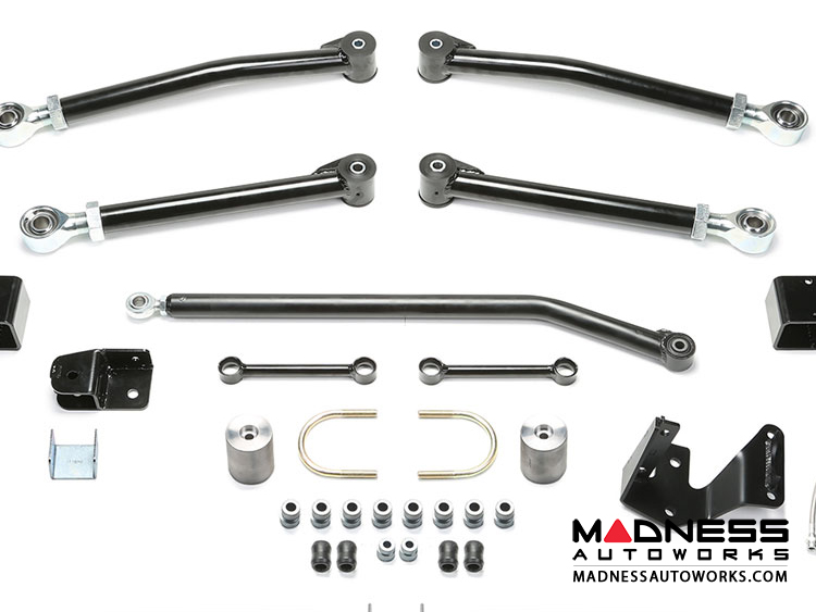This Short Arm Trail system replaces all four lower link arms because of their vulnerability to obstacles out on the trail. The heavy duty Link Arms maintain factory parallel joint angles in effort to reduce bushing wear. Constructed of .250” thick wall tubing and 5 Ton Joints, this system is guaranteed to hold up to the abuse. The front and rear track bar brackets weld on and re-centers the axles to accommodate for the increased ride height. This system includes Fabtech’s standard coil springs for balanced performance.