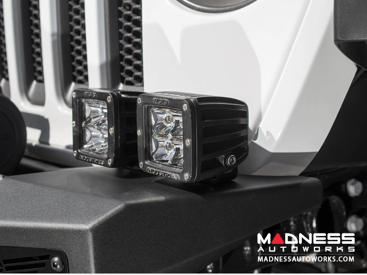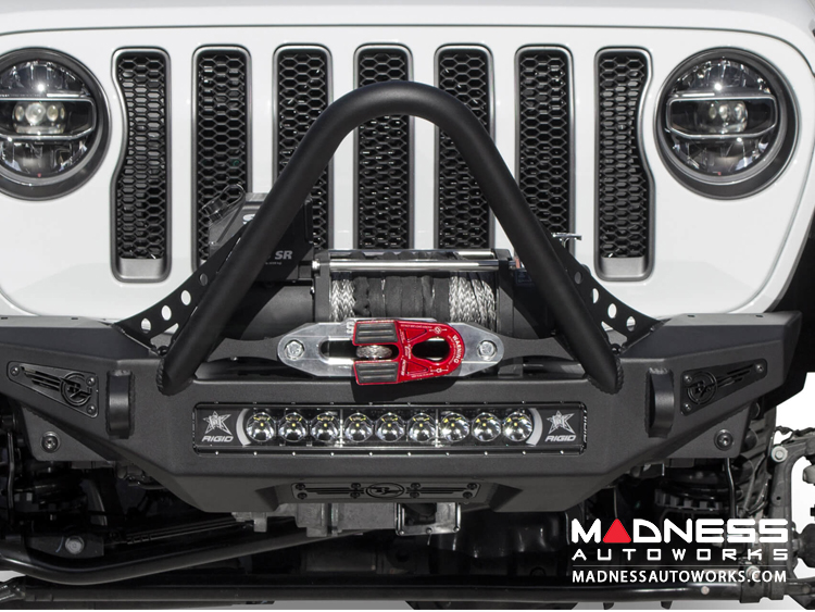 With greater approach angle to maximize offroad performance and two different style hoop options for front end protection, the Rock Fighter front bumper for the Jeep JL gives your Jeep style and functionality. A patented universal light mount system in the center of the bumper allows mounting of any brand and size of light up to a 20" radius light bar or up to 5 cube lights. Additional lighting can be added to the top corners of the Rock Fighter bumper with mounts for 2 cube lights per side. Two clevis mounts on the front of the Rock Fighter front bumper accept a 3/4" D-Ring and are reinforced to help out in tough situations.