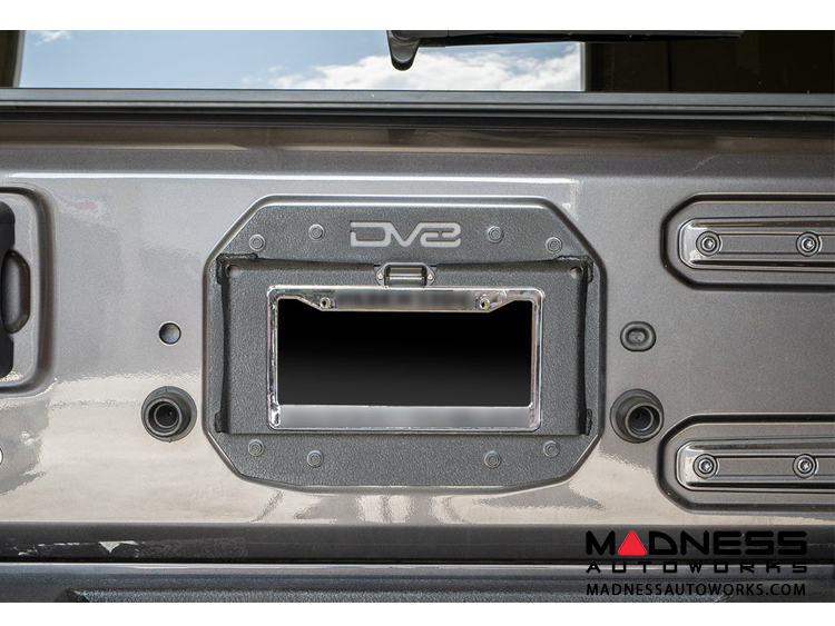 The Jeep JL Spare Tire Delete Kit fits over the raised vent area in the center of the tailgate. CNC-laser cut from 3/16" steel the stamp comes powder coated in a textured black finish and installs easily using the stock tire carrier mounting bolts. Installing the kit requires removal of the stock air vent flaps, so that it may sit flat against the tailgate for a clean appearance.