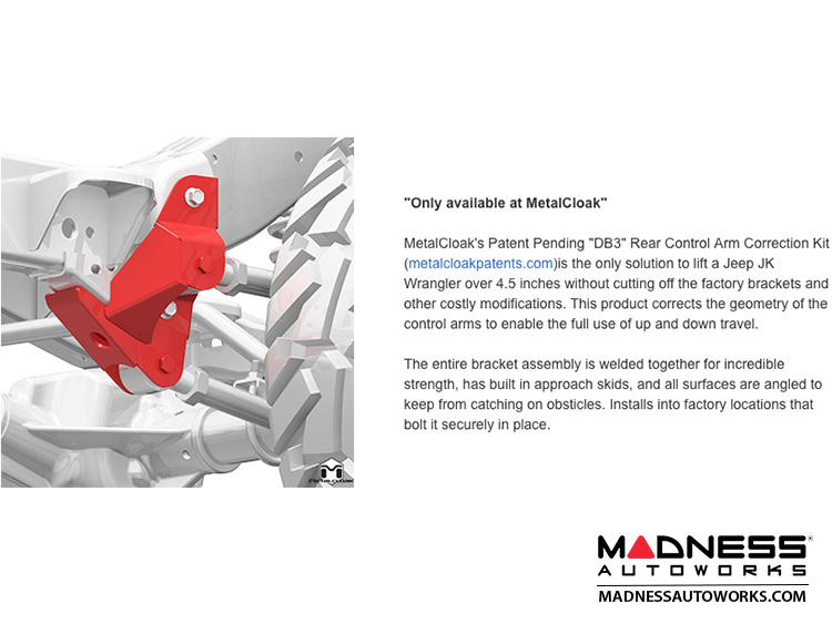 The JK Wrangler "Bolt-On 5.5" Game Changer Suspension Kit, No Shock Edition is the ONLY BOLT ON SYSTEM that allows for proper control arm geometry at this lift height. Front and Rear geometry correction brackets are only found at MetalCloak allowing you to get the lift height you want without cutting off the factory brackets or other costly modifications.