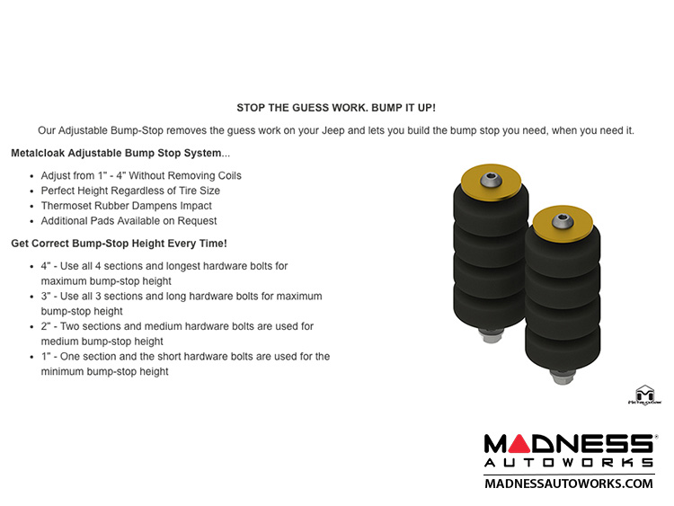 - Note: All lifted 2012+ JK's require exhaust spacers to clear front drive shaft at full droop. And it's recommended you have a suspension specialist align your Jeep once a MetalCloak Suspension is installed.